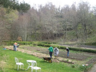 We figured the vegetable gardens would be less arduous and more entertaining as a communal effort. This kicked off yesterday with Katie, Rory, Craig and Sikuri getting busy with the potato and herb beds and planting the first carrots. The purple sprouting broccoli is doing well and some of the salads, flowers and beans have sprouted in the sunroom. The idea is to share the proceeds between all involved, to supply guests in the house and Ord Ban. We also picked up another 6 chickens, pale, timid, and raised to date in a shed, they are now figuring out what it means to be a chicken, the joy of the great outdoors tempered by the surprisingly dictatorial and vindictive nature of their incumbents.