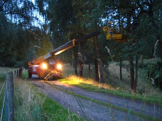 The gutters on the main house are a lovely profile in cast iron but the ones on the front were looking crooked. On Thursday I finally got round to getting the long ladder out and, wobbling my way to the top, a great can of worms was opened. Plastic filler, impermeable and unprimed paint, seams of silicone holding water in the soffits, rotten woodwork, splits in the lead and an infestation of both wasps and bees. The last decorator now has a price on his head. The yellow pages gave us George the wasp man, who turned up the next day, and Angus from Spey Building and Joinery stepped up to the plate with a huge yellow telehandler and the help of two excellent guys. By yesterday evening Nick and James had all the gutters on the ground and by this evening we had remade most of the soffits, repaired the woodwork, raked huge tongues of dripping honeycomb from between the rafters and started the arduous task of cleaning up each section of gutter, welding up any cracks, priming and painting them, so far 6 sections done, probably 60 to go.