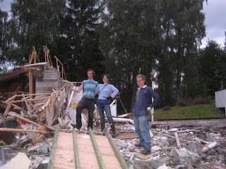 With the house now finished the bothy is getting an overhaul. In our usual Borrowers style we are spending nothing on it so every time I drive past a building site or a refurb I swing in with some unusual barter. This week a 1950s house was being pulled down and in exchange for 4 slices of cake we lightened their skip to the tune of the floor, the windows, some joists, bits of bathroom and a smashed conservatory. Over this weekend Rufus, Molly and I are cunningly transforming our haul into doors, walls, window frames and a raised bed.